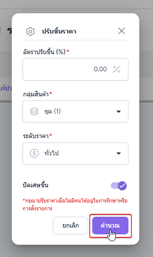 เมื่อกรอกข้อมูลตามที่ต้องการเสร็จสิ้น คลิก คำนวณ ระบบจะบันทึกการปรับราคา