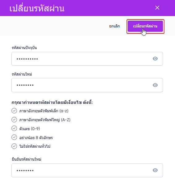 ผู้ใช้งานระบุรหัสผ่านปัจจุบัน รหัสผ่านใหม่ และยืนยันรหัสผ่านใหม่