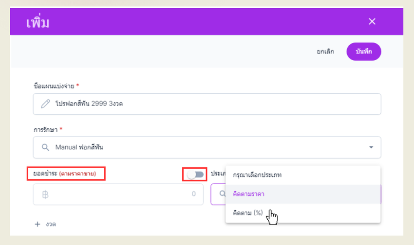 ประเภท : ผู้ใช้งานสามารถเลือก ประเภทการคิดเงินของงวดได้ คิดตามราคา , คิดตาม %