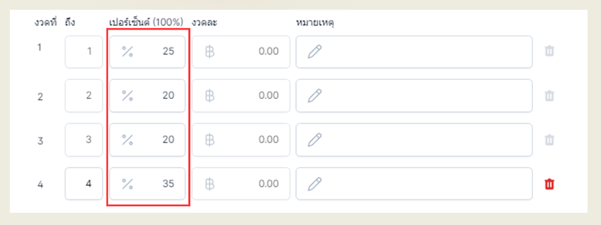 งวดที่ 1 -4 ราคางวดละ 25% หากต้องการคิด % ของแต่ละงวดไม่เท่ากัน สามารถคลิกที่ "+ งวด"