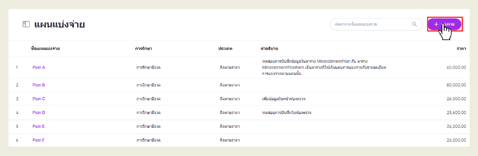 เมื่อผู้ใช้งานเข้าสู่หน้าแผนแบ่งจ่ายแล้วไปที่เพิ่มแผนแบ่งจ่าย
