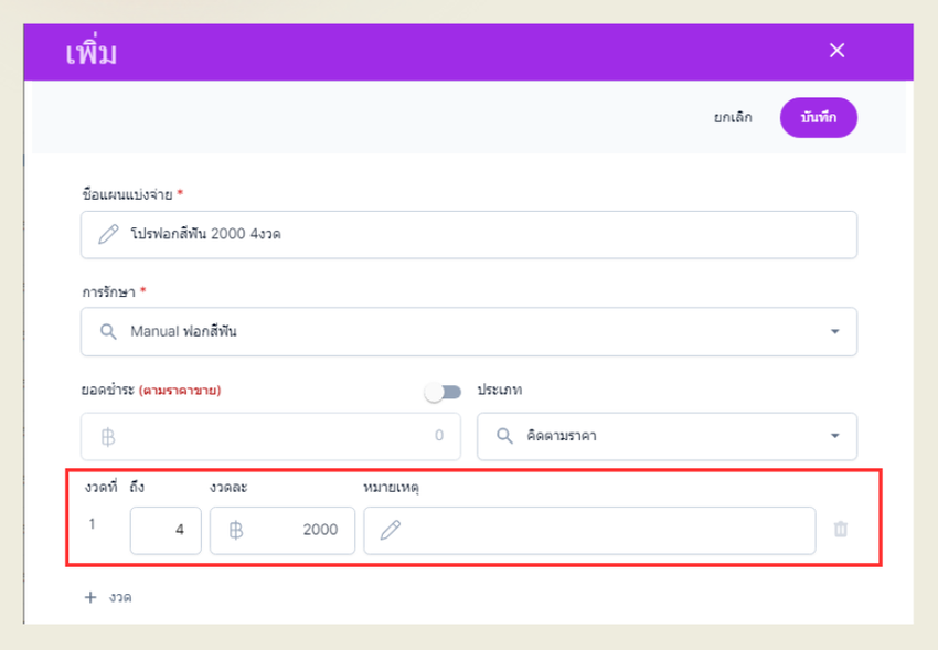 งวดที่ 1 -4 ราคางวดละ 2000 บาท หากราคาแต่ละงวดไม่เท่ากัน สามารถคลิกที่ "+ งวด"