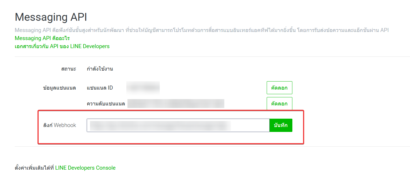 จากนั้นให้ผู้ใช้งานคลิกที่ Line Developers Consle (อยู่ด้านล่าง ลิงก์ Webhook)